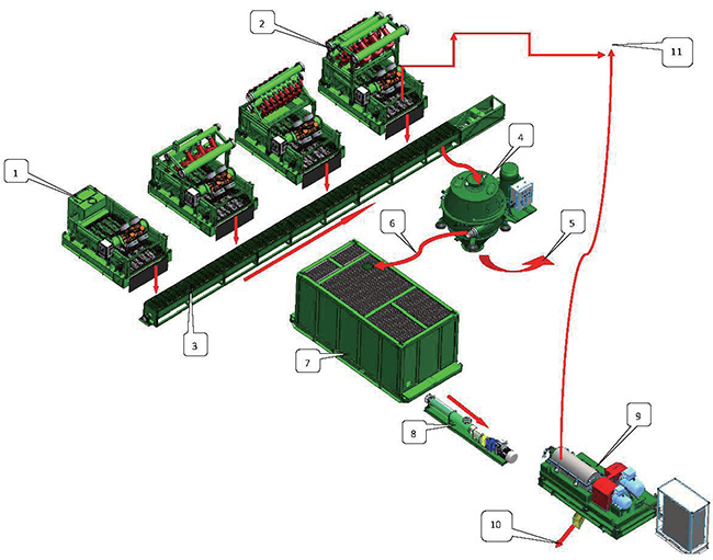 鉆井泥漿不落地處理工作流程說明如下:鉆機過來的泥漿通過高架管匯進入振動篩(1)、清潔器(2),經過(1)、(2) 處理排放的鉆屑通過螺旋輸送器(3)輸送至立式甩干機處理(4)。立式甩干機處理完的固體通過廢渣(5) 排除,回收到的鉆井泥漿(6)進入鉆井液泥漿罐體(7),離心機供液泵或螺桿泵(8)抽取含有細固 顆粒的回收泥漿,供給離心機(9 )處理,固體部分通過固體排渣口(10)排除,處理完成的鉆井液通 過干凈泥漿回歸泥漿系統(11)。